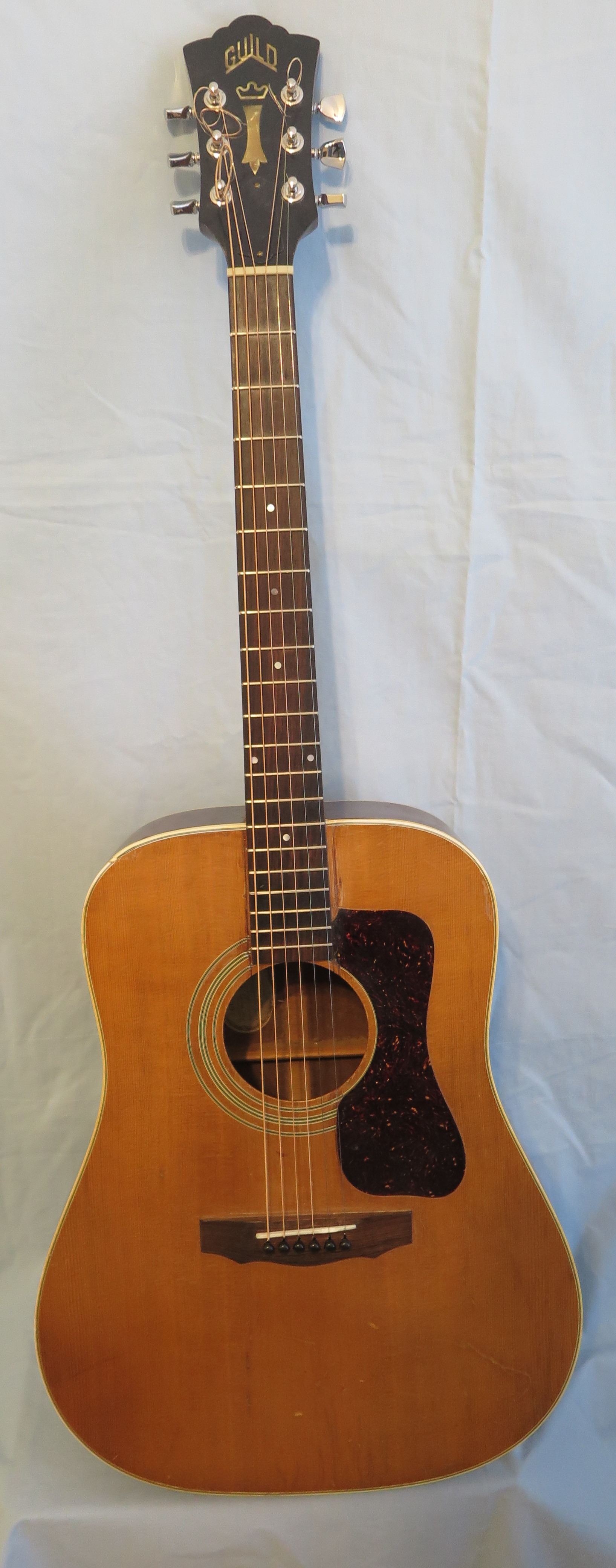 The guitar has a two year structural warranty. See warranty statement below. Ever wish you could own a vintage Guild D-40 dreadnought but could not afford it? This is your chance. This appears to be a USA made mid-70’s guitar. Nice playing and sounding players D-40. The back is surprisingly clean, as are the sides all around. The entire guitar has the usual age related wear, but no play wear. There is plenty of evidence of repair work on both sides of the fret board extension. Structural repairs (i.e. under the top) are very complete, comprehensive and of professional quality. Cosmetic considerations were not especially attended to because of the nature of the damage. So, yes it looks pretty bad in places. Action is 4/64 inch at the 12th fret. That is right at 1/16 inch. Set up and sounds good with light gauge strings. Neck and fret board are in excellent condition. We refinished the neck back, and cleanup up the fret board. Intonation is good. This is a players guitar, not a collector’s instrument. It plays nice all the way up the neck.