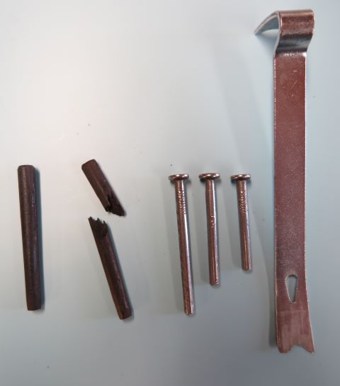 The pins are tapered. So, you can only push them out from the small side. Generally, the pin closest to the guitar top has the large side standing proud on the left (guitar neck oriented on the left for right handers). The bottom pin has the large end standing proud on the right. This is important to know. You can always tell where the large end is because the large end is always standing proud from the side of the neck block. If one pin end is visible, you know right away that you going to press the pin out from the opposite end. To press broken pins out, you should prepare three 20 penny bright common nails as shown below.