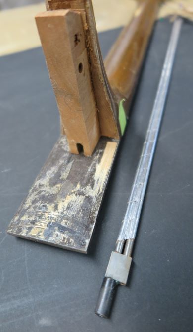 In the picture above you see two ebony pins, one whole, one broken. Also, there are three cut off nails with heads intact. Nail number 1 is 1 ½ inch. Nail number two is 1 ¾ inch. Nail number 3 is 2 1/8 inch. You want smooth nails. Not screws. Do not be tempted to use screws as these will jam in the pin holes. Also, be sure to use “bright common” nails. Other versions may have green or brown colored adhesive. That may also cause problems. The tool on the right is a very small Vaughn brand pry bar. I modify and use these for all kinds of pin and screw removal tasks. I like that brand the best because the steel is best. Note the modified curve ground into the straight end. Use that end to pry out stuck nails. Three nail lengths may be needed because the working space inside the upper bout is very limited. Use the #1 first, then #2, finally, #3 depending on how hard the pin is to force out. Be sure to press from the small end of the pin.