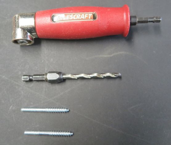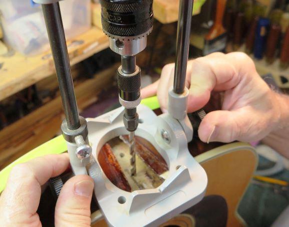 (Guitar body shown above is not a Gurian, but you get the idea.) This should miss the serial number and model number stampings on the neck block. 8. After the holes in step 7 are drilled, push and hold the neck and tenon into the body taking care not to stress the fret board extension (i.e. the top). Be sure to press the neck heel against the body. This might take two people. Use the tool and drill bit (3/16-inch) assembly shown below to locate two holes in the tenon. Only drill very shallow holes at this point. You are just marking hole locations in the tenon. Drill inside the guitar body, towards the tenon. The red right angel driver (or similar) shown below allows drilling through the neck block from inside the body thereby marking the holes accurately in the tenon.