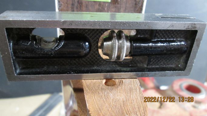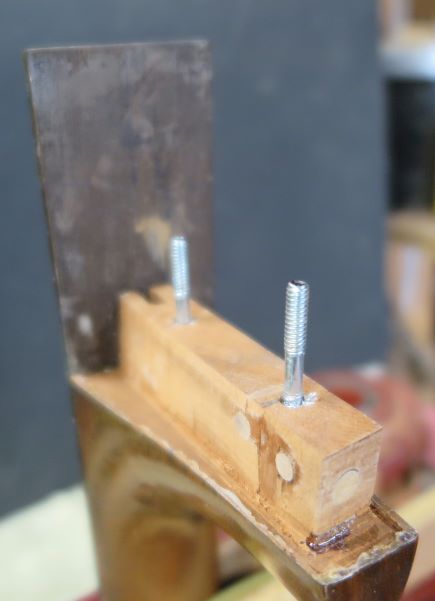 9. Remove neck from guitar body and place vertically in a vise. Pad the vise jaws. Drill two 11/64-inch holes 1-inch deep and perpendicular to the face of the neck tenon. Maybe it is more accurate to say “parallel to the center line of the fret board”. I use a mini level to set the neck vernicle in the vise. Helps a little. Now you see the reason for the 5/16-inch dowel rod. Should counter bore about ¼-inch into the 11/64 holes just drilled with a slightly larger bit. This prevents splitting the tenon. Install two hanger bolts. These are 10-24 thread 1 1/2-inch long. One end has coarse thread which goes into the tenon. These are shown in the previous image and below, installed. When you buy the hanger bolts, also buy the nuts to fit and two washers.
