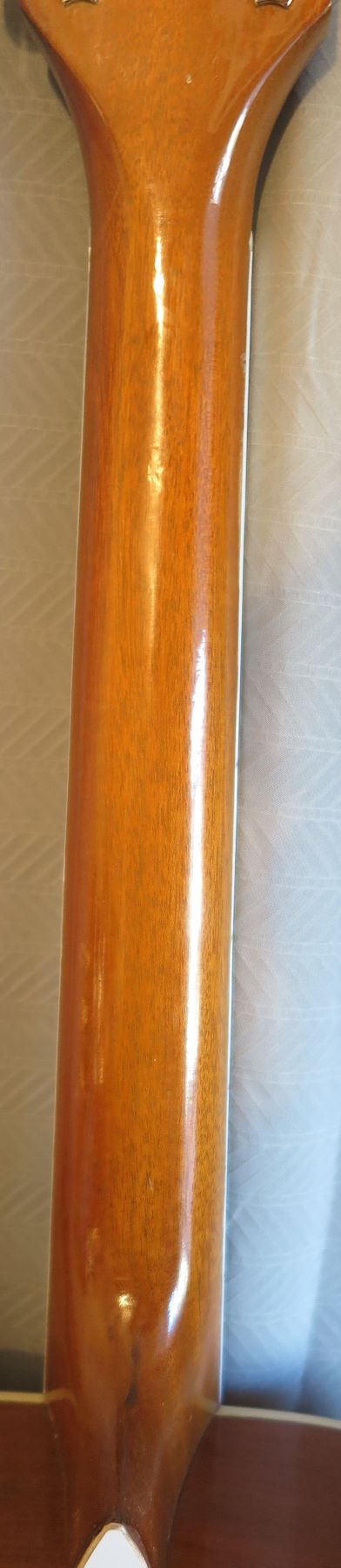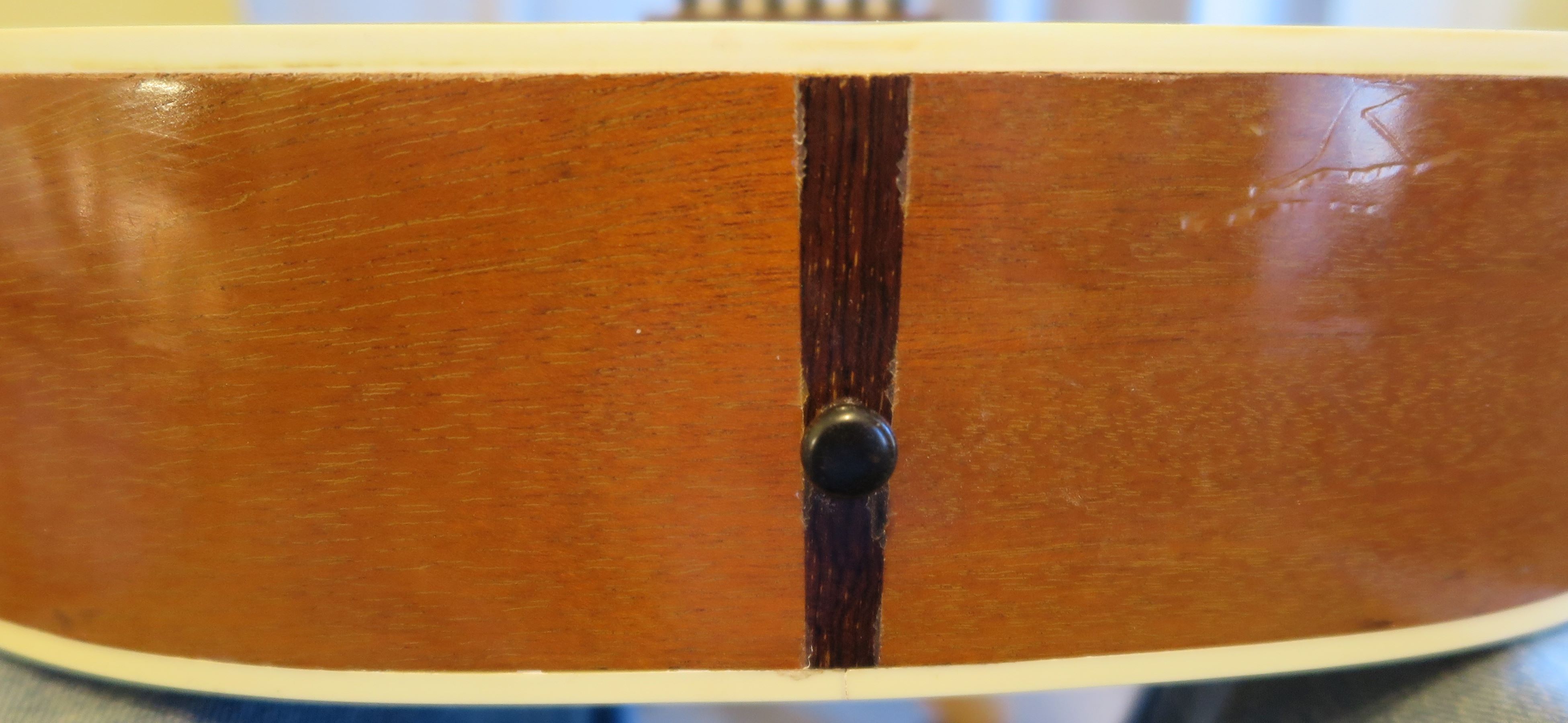 Back was removed, ladder bracing on top was removed, new V-bracing installed. This is a great innovation in top bracing. When a guitar has top distortion, V-bracing easily corrects the issues. Reason is, the braces are full length, block to block. The braces are adjacent to the sound hole 1/4 to 3/8 inch away, and go over and are glued to the reinforcing plate. Also, Harmony used spruce for the reinforcing plate. This is adequate for a string through bridge, but not at all for a pin bridge. So, this is replaced with maple.