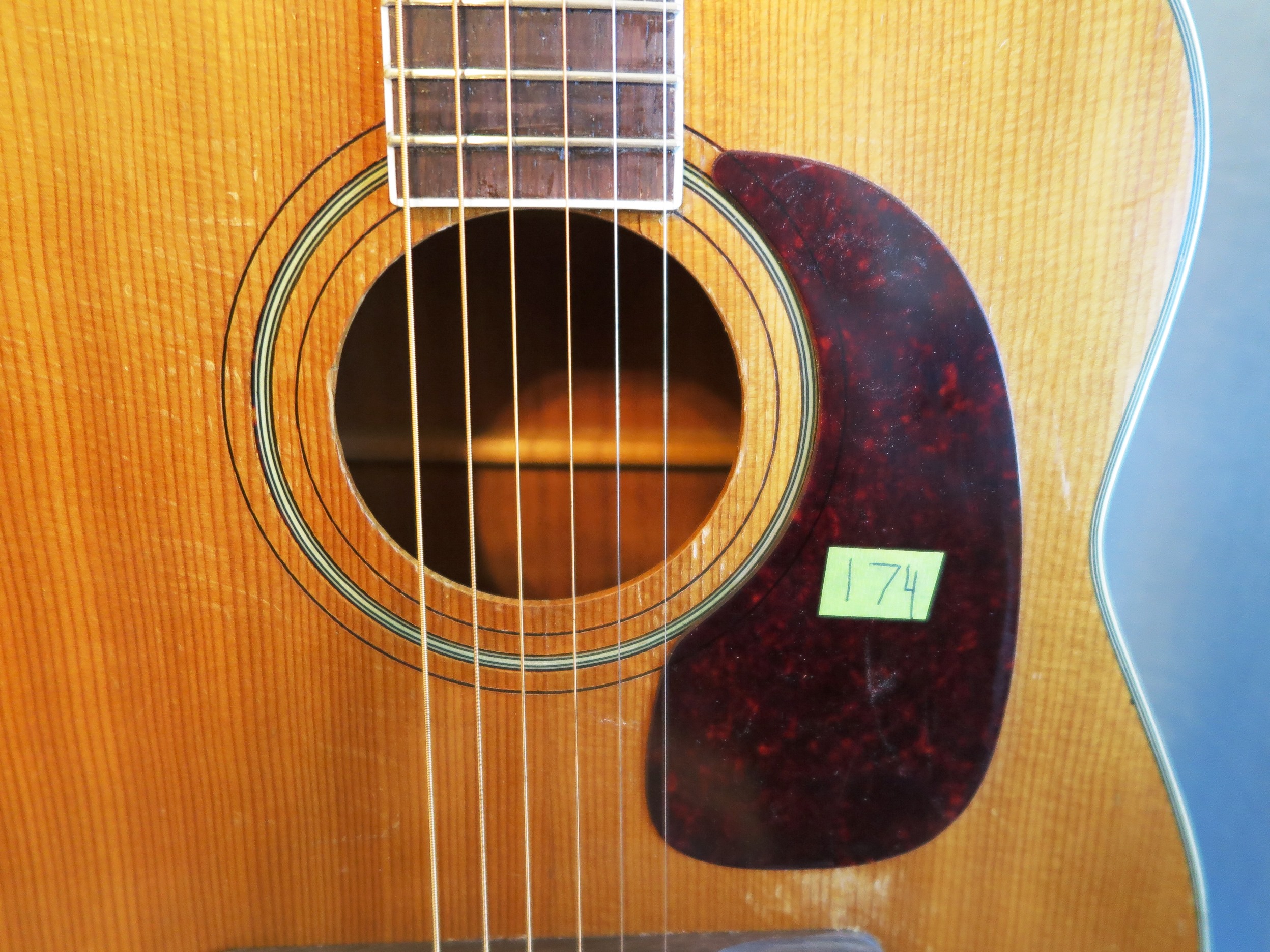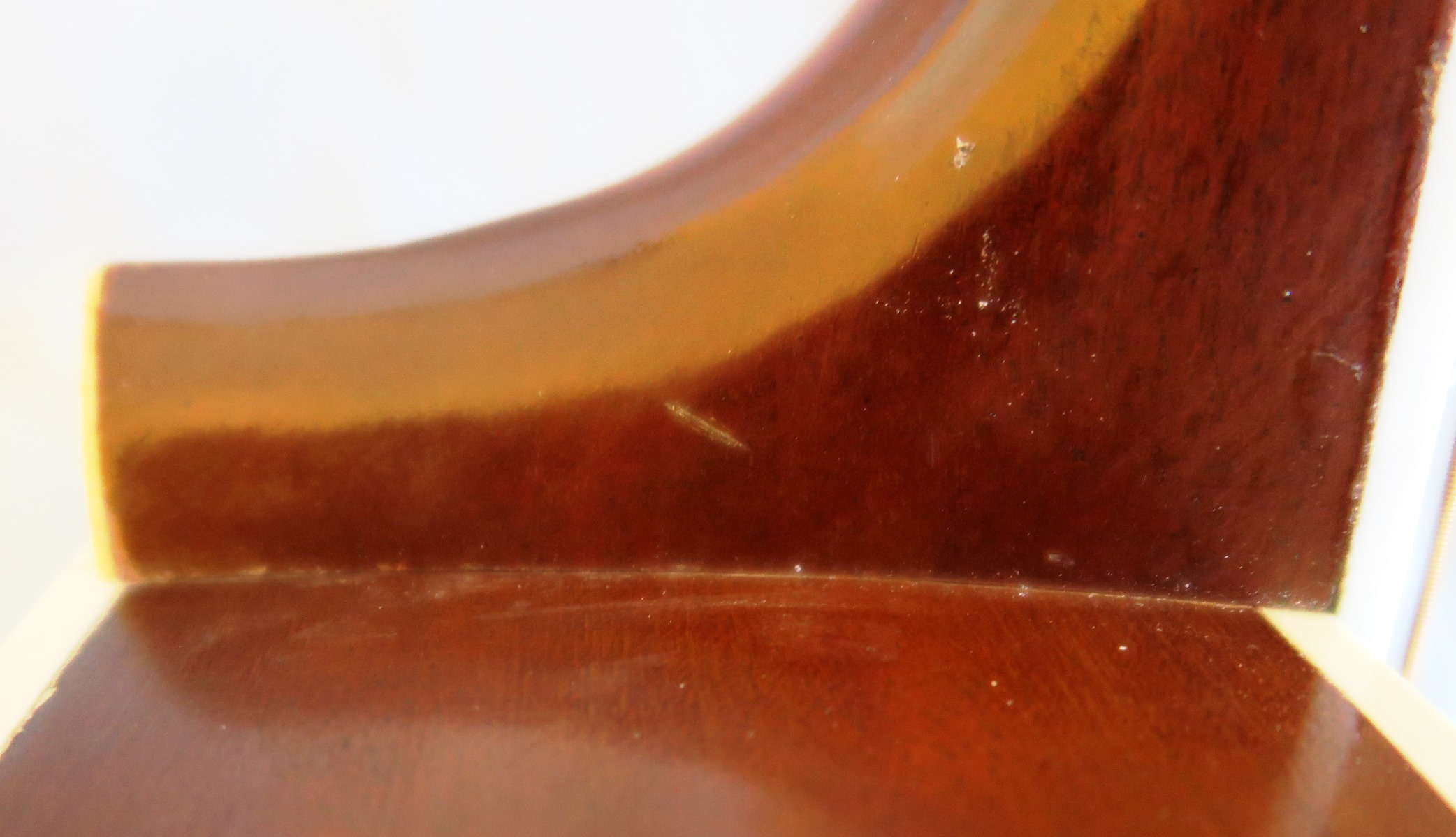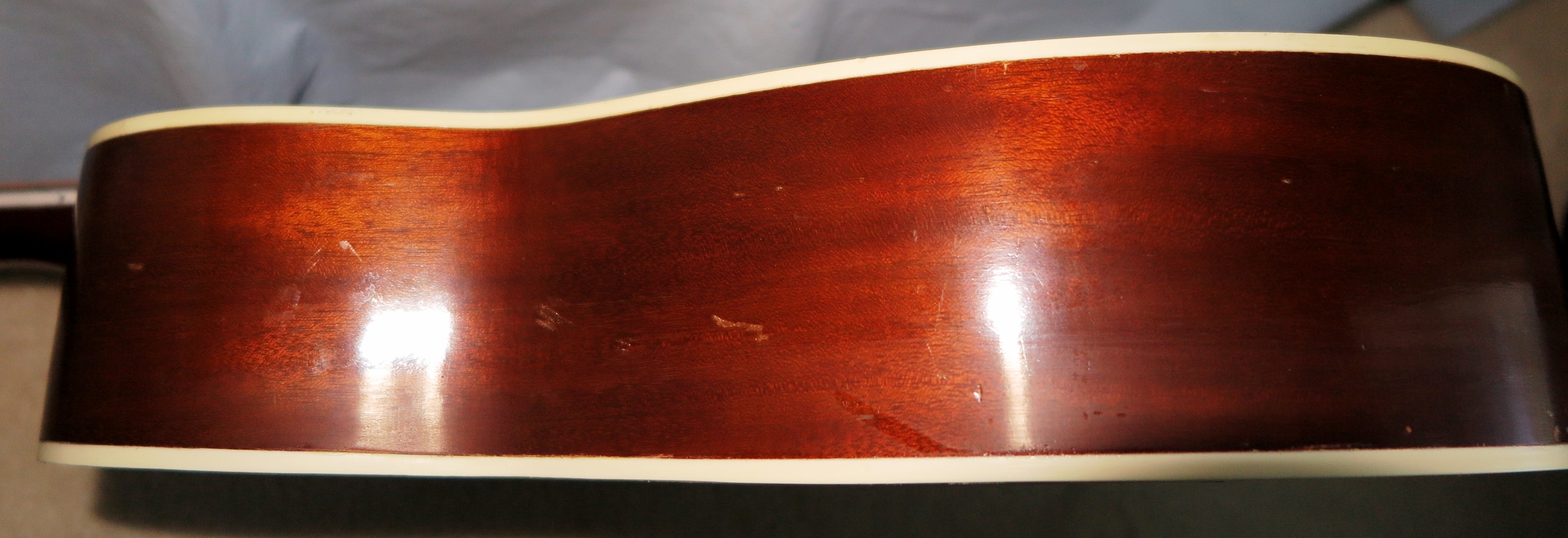 Excellent top has four almost invisible streaks of pick wear above the sound hole. Visible thru the finish pick wear south and west of the pick guard. We left this as is. There is an odd dark color stain below the bridge. I think someone was doing their finger nails in brown. One 3 inch crack on side. Otherwise, back and sides are mostly clean. There are the usual dings and marks here and there consistent with age and use.