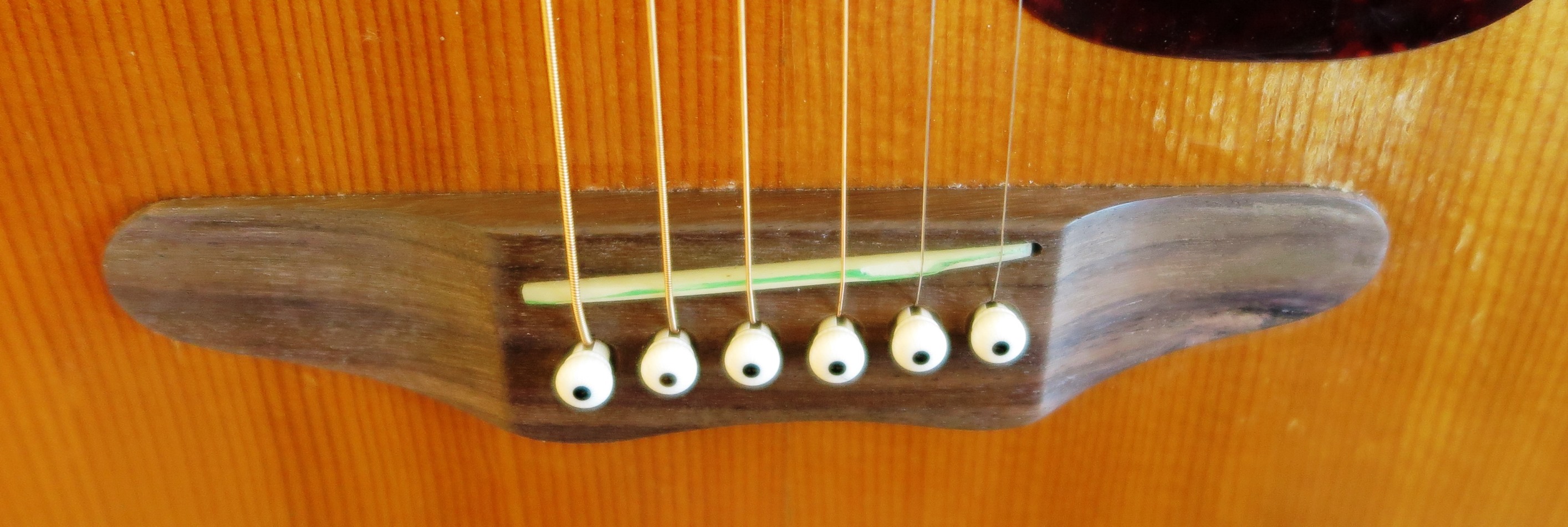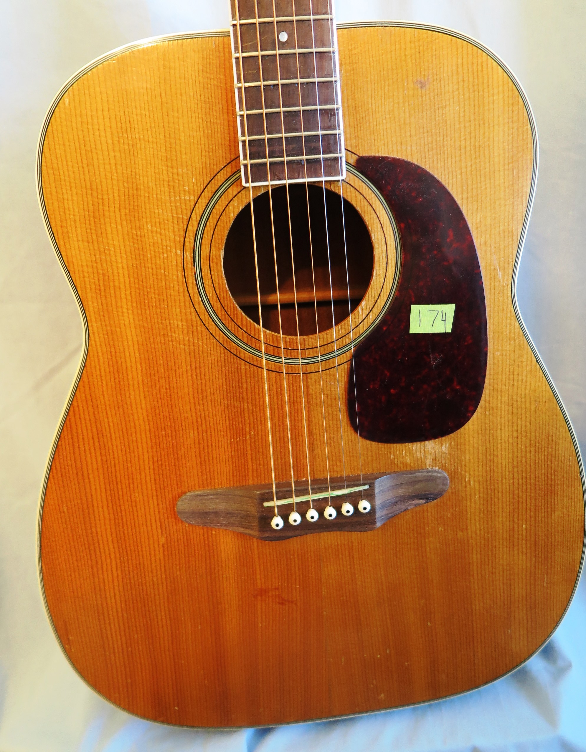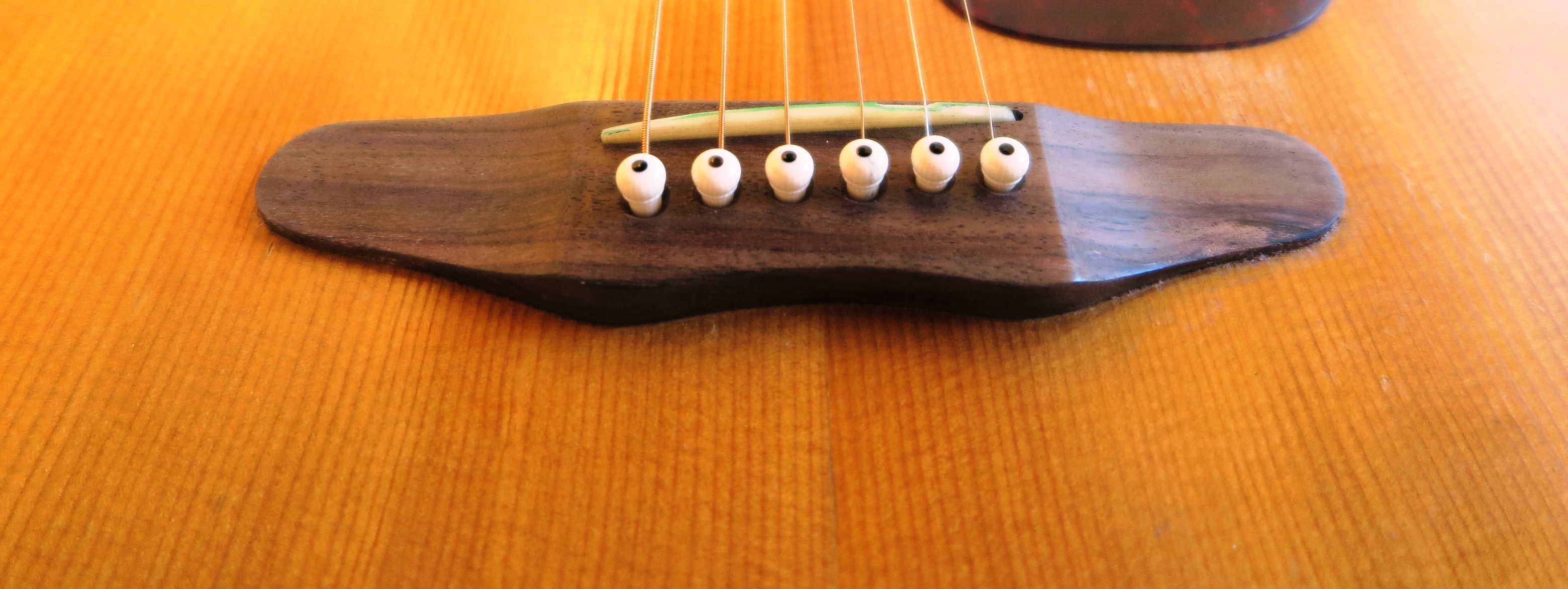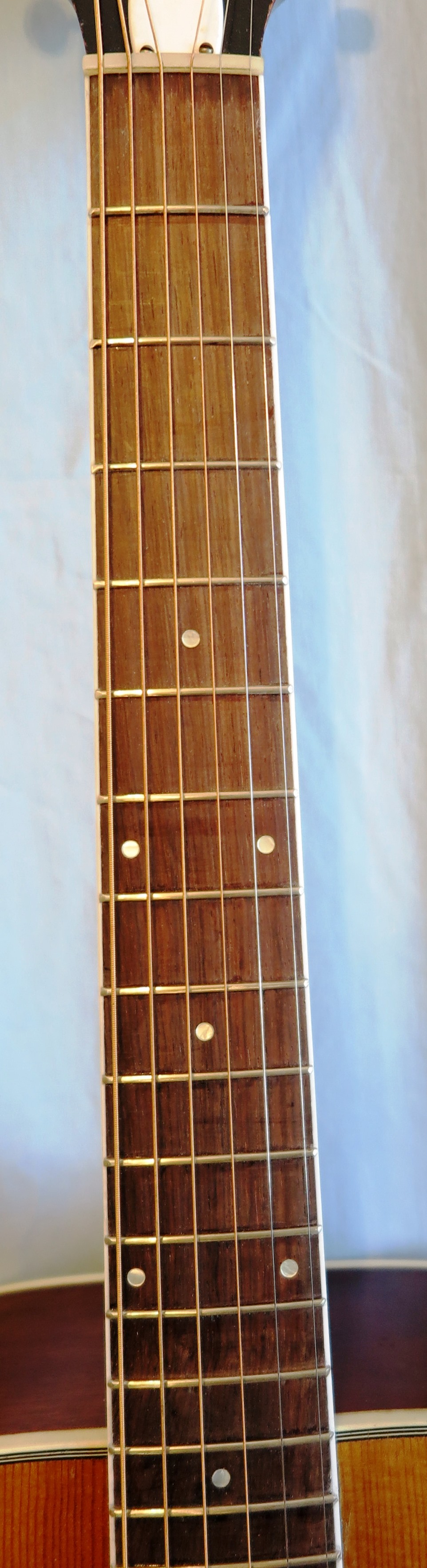 Excellent top has four almost invisible streaks of pick wear above the sound hole. Visible thru the finish pick wear south and west of the pick guard. We left this as is. There is an odd dark color stain below the bridge. I think someone was doing their finger nails in brown. One 3 inch crack on side. Otherwise, back and sides are mostly clean. There are the usual dings and marks here and there consistent with age and use.