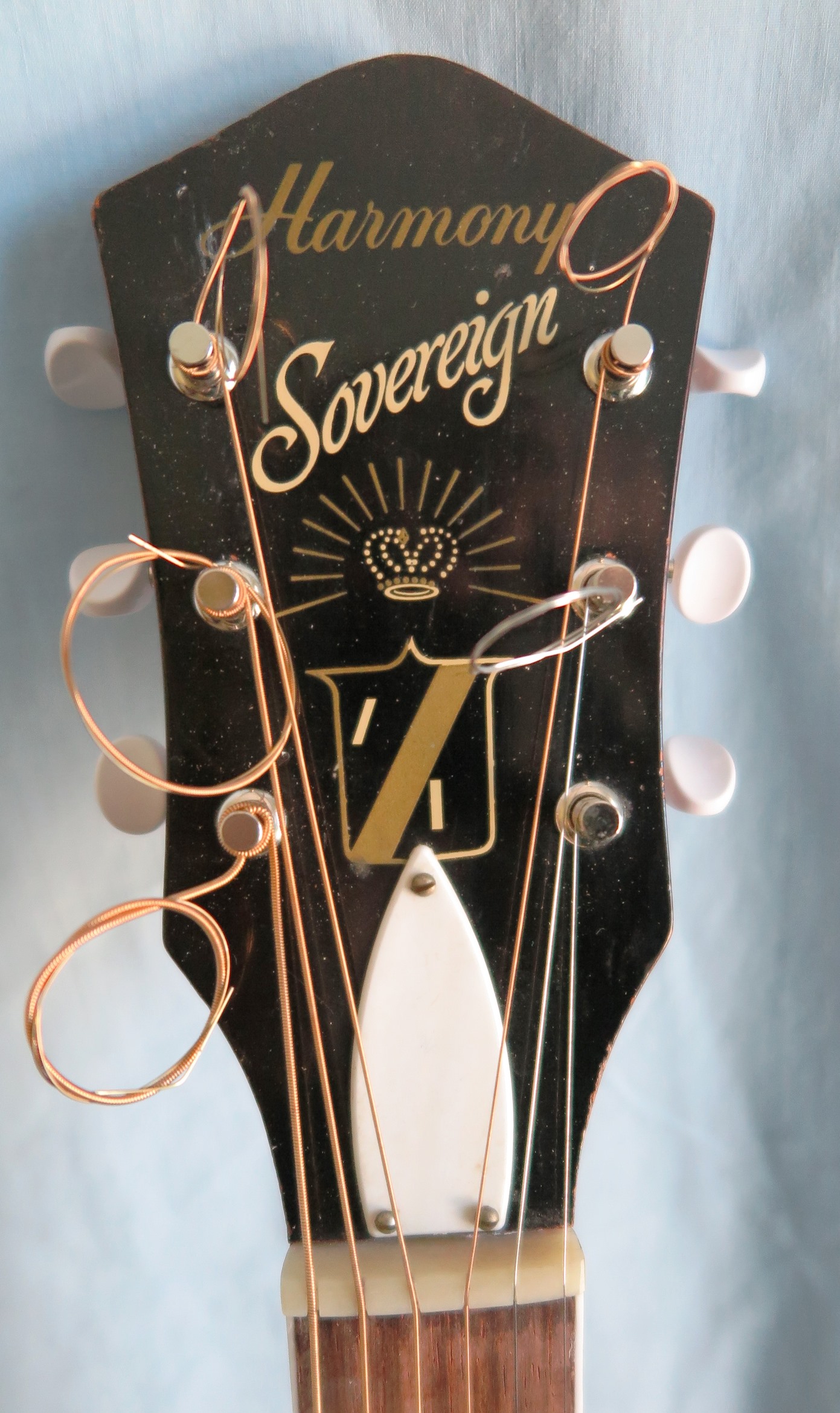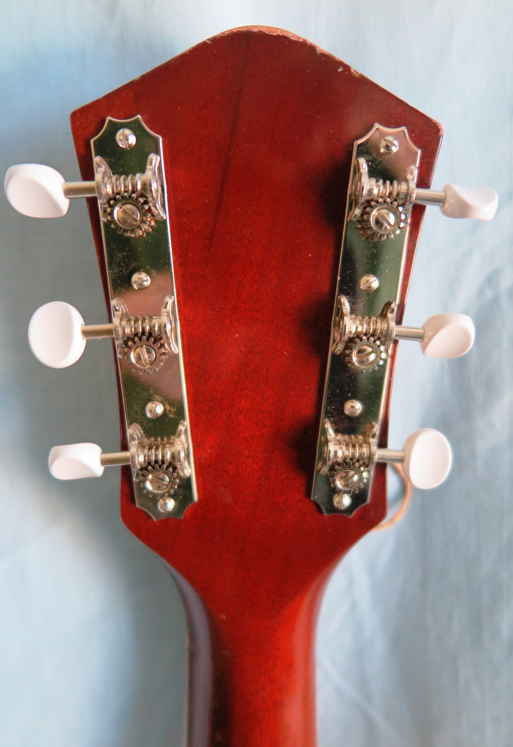 We pay attention to fine details. The inside back and sides are cleaned up and sanded smooth. We chip out all of the glue globs. Braces are tapered and sanded smooth. Serial numbers (if any) are preserved. Back braces are rounded and sanded smooth. We use a drill press and reamer to install new solid metal bushings and modern tuners. We do what Harmony should have done 50 years ago.