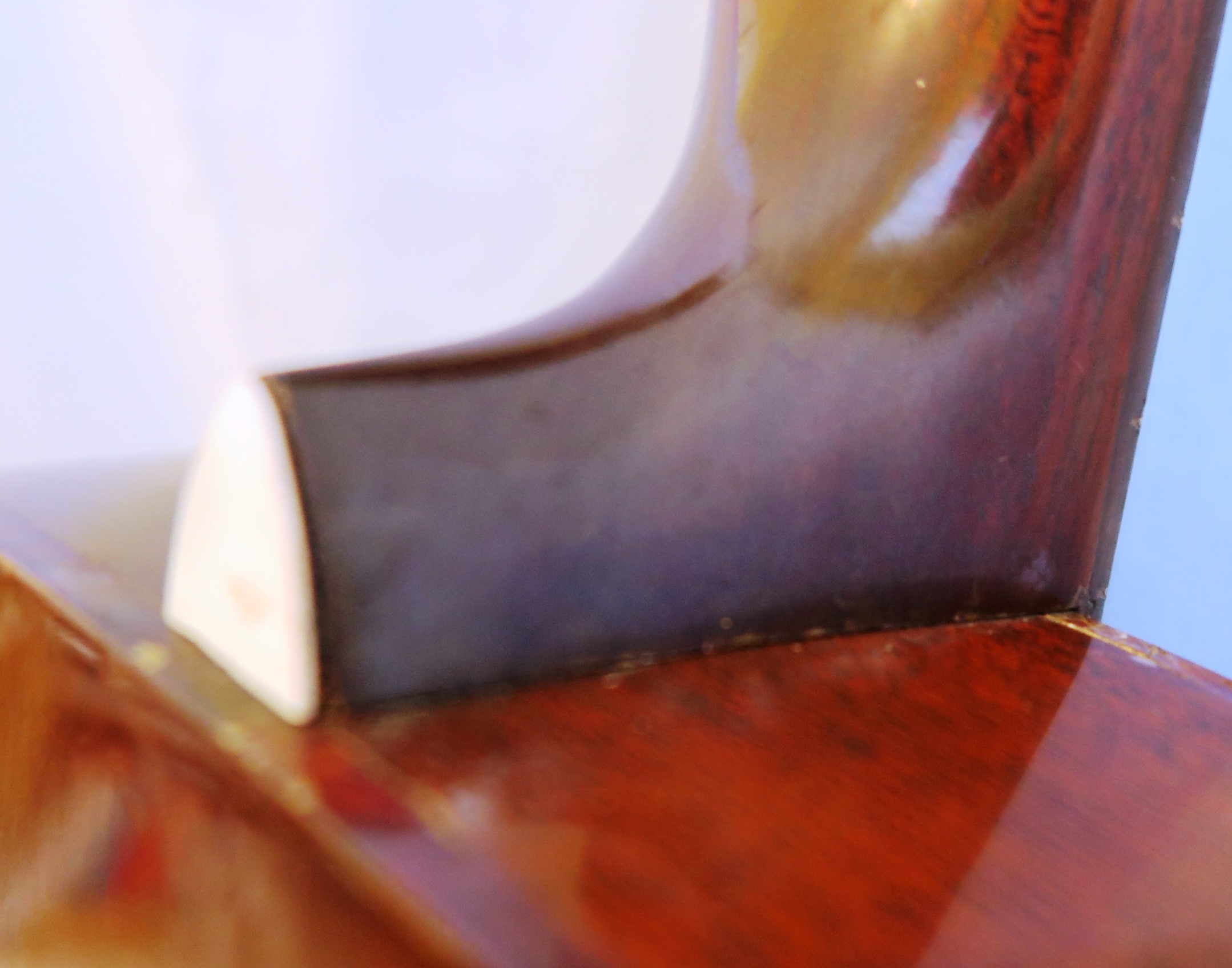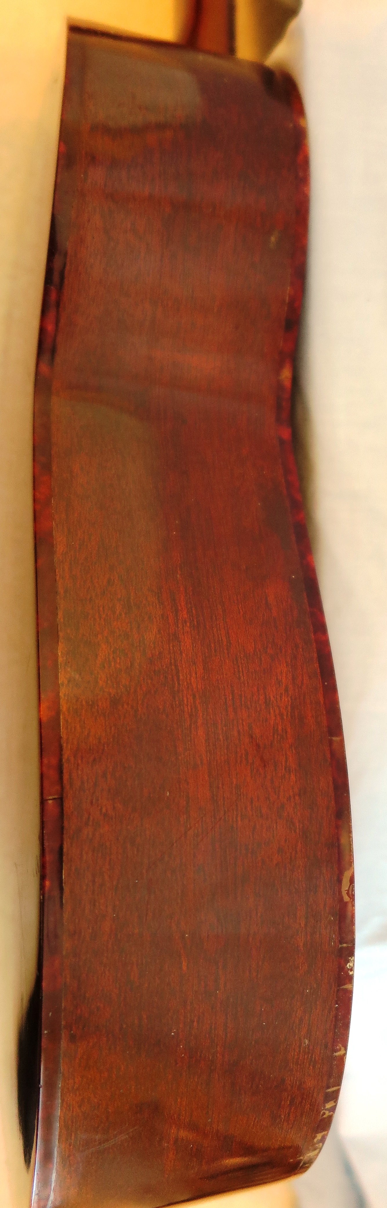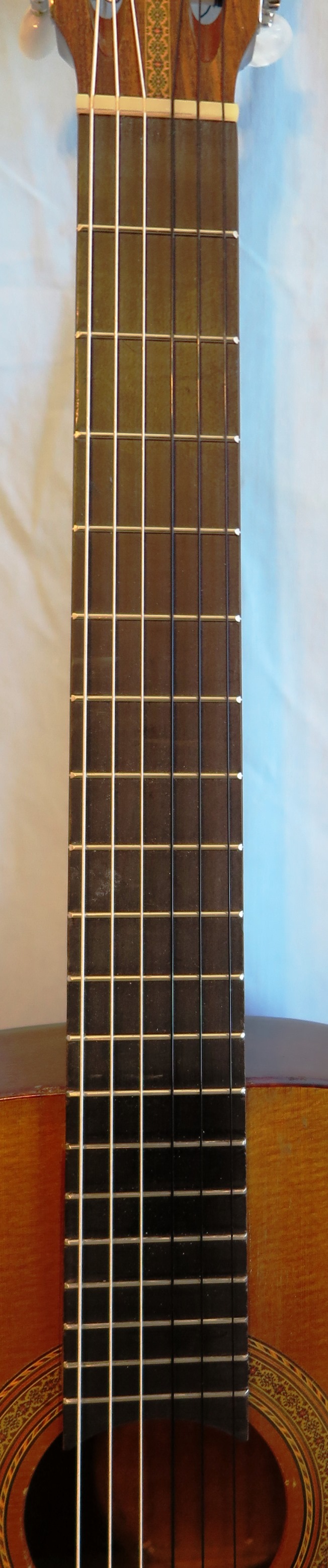 This guitar was very obviously much loved and much played, possibly by a professional or performing artist. There were extensive wear marks all up and down the fret board. These are all removed. We plained the fret board to dead flat. String tension adds just the right amount of relief.