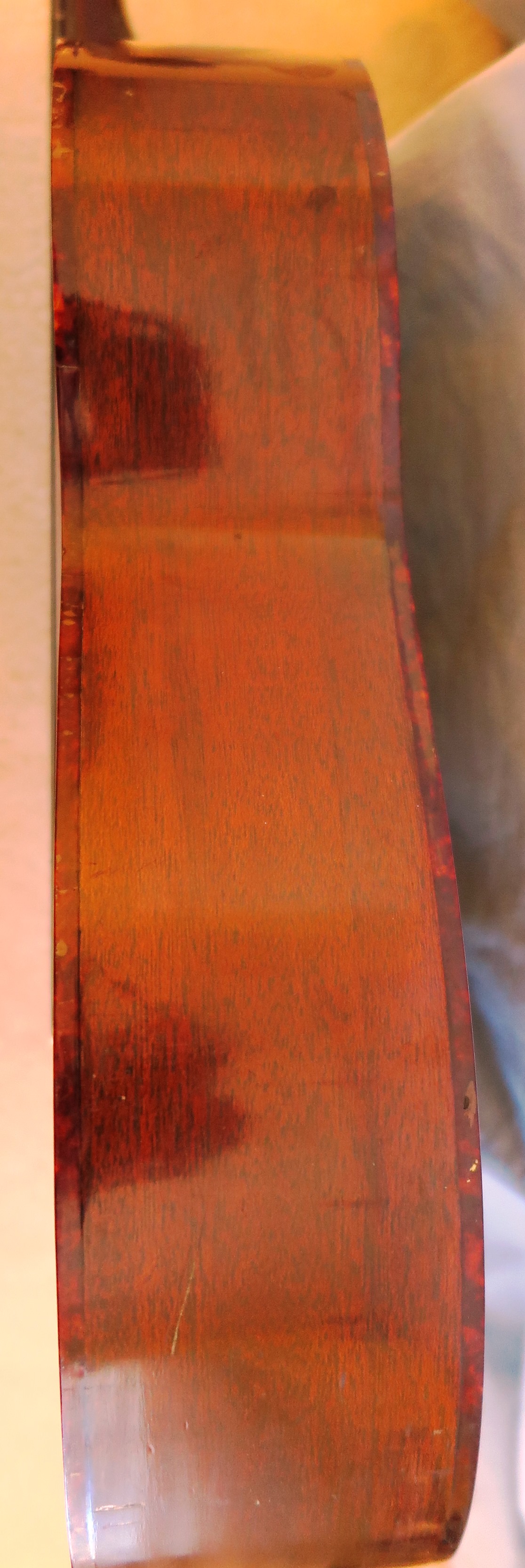 There are some very shallow abrasions on the down side top near the fret board extension. Finish is all there. The binding is starting to crack, however it is still firmly attached. I can’t get binding with this color, left it as is. Don’t think it will be a problem.