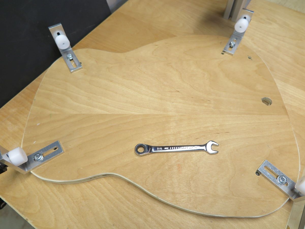 Ignore the StewMac instructions for mounting guitar body onto the angles. Ignore the instructions for attaching the angles onto the plywood guitar body shape. You are mounting the four aluminum angles on the ¾-inch plywood guitar body shape. Install hex head 1-inch X ¼ 20 bolts and washers down through the angles and into the plywood into some ¼ 20 T-nuts. Buy a flat 7/16-inch quick wrench. Install and level the guitar body top down (for back binding) onto the aluminum angles which are sitting on the plywood guitar body shape. The instruction "Verify the guitar sides are perpendicular to the plywood" is nonsense. Use a level on the guitar back. See below. Use the quick wrench between the guitar top and the angles to loosen or tighten the bolts as needed to lock the angles in place. The quick wrench makes adjusting and affixing the angles and bolts easy. Just be sure to leave enough space between guitar top and the bolts. An inch is plenty.