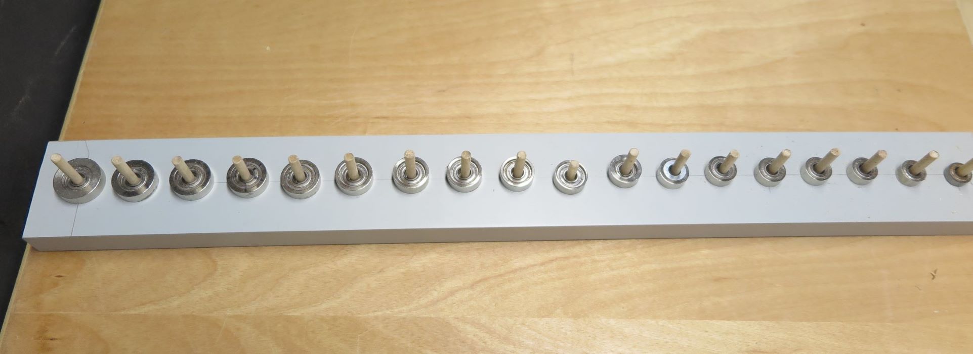 Make a bearing storage rack. I used a ¾-inch X 3-inch wide piece of maple to mount the bearings all in a straight line sorted largest to smallest. (When will we ever use those tiny guide bearings? Triple herring bone binding?) You will find that locating the bearing for optimum depth of cut requires comparing slightly larger or slightly smaller bearings until the best fit is found.