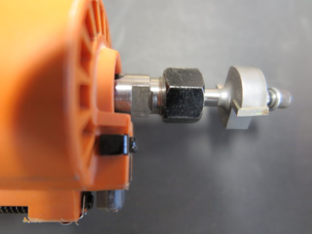 The instructions suggest using the suppled router centering guide when installing the a different trim router on the platform. The supplied centering guide implies that absolute centering of the router chuck is required, but it is not. The cutter bearing won’t allow a bad cut as long as the appropriate bearing is selected. However, being a precision oriented kind of guy, I used the centering guide anyway. You push the ¼-inch pin into the plastic guide thingy, chuck the pin into the router, then push the plastic ring thingy with router installed on to the router platform.