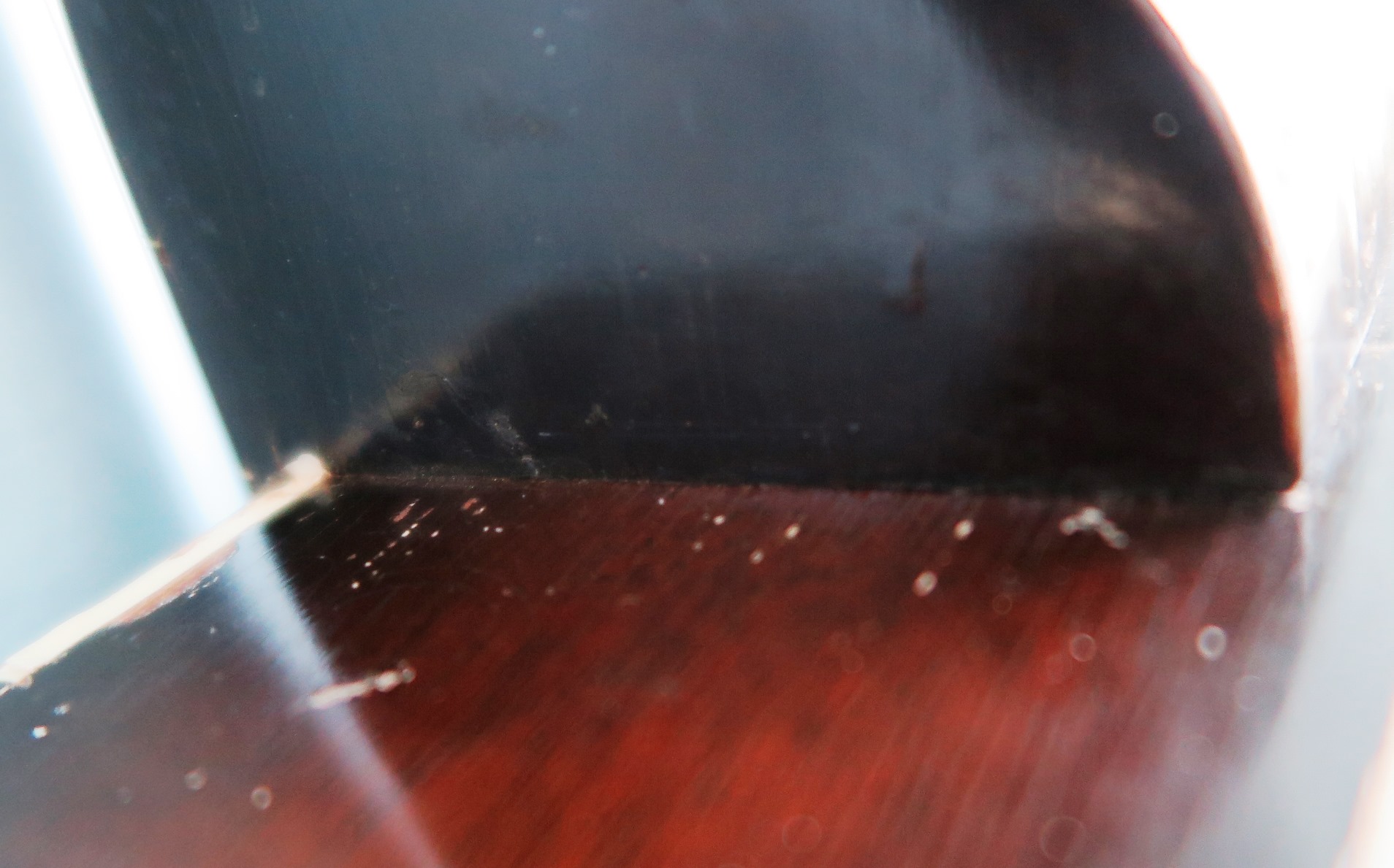 Finish is consistent throughout. The images show some odd light reflections, but this is only light. There are no odd color areas, excepting small scratches. Only the top is refinished. Back and sides are original finish.
